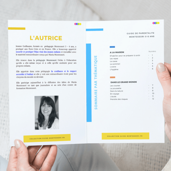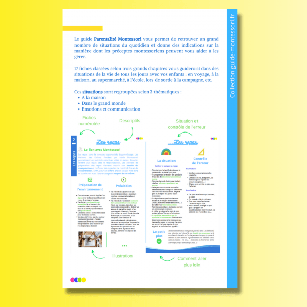 Le guide Parentalité Montessori vous permet de retrouver un grand nombre de situations du quotidien et donne des indications sur la manière dont les préceptes montessoriens peuvent vous aider à les gérer.
