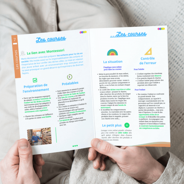Le guide Parentalité Montessori vous permet de retrouver un grand nombre de situations du quotidien et donne des indications sur la manière dont les préceptes montessoriens peuvent vous aider à les gérer. Ce guide (e-book) regroupe 17 fiches classées selon trois grands chapitres vous guideront dans des situations de la vie de tous les jours avec vos enfants : en voyage, à la maison, au supermarché, à l’école, lors de sortie à la campagne, etc.